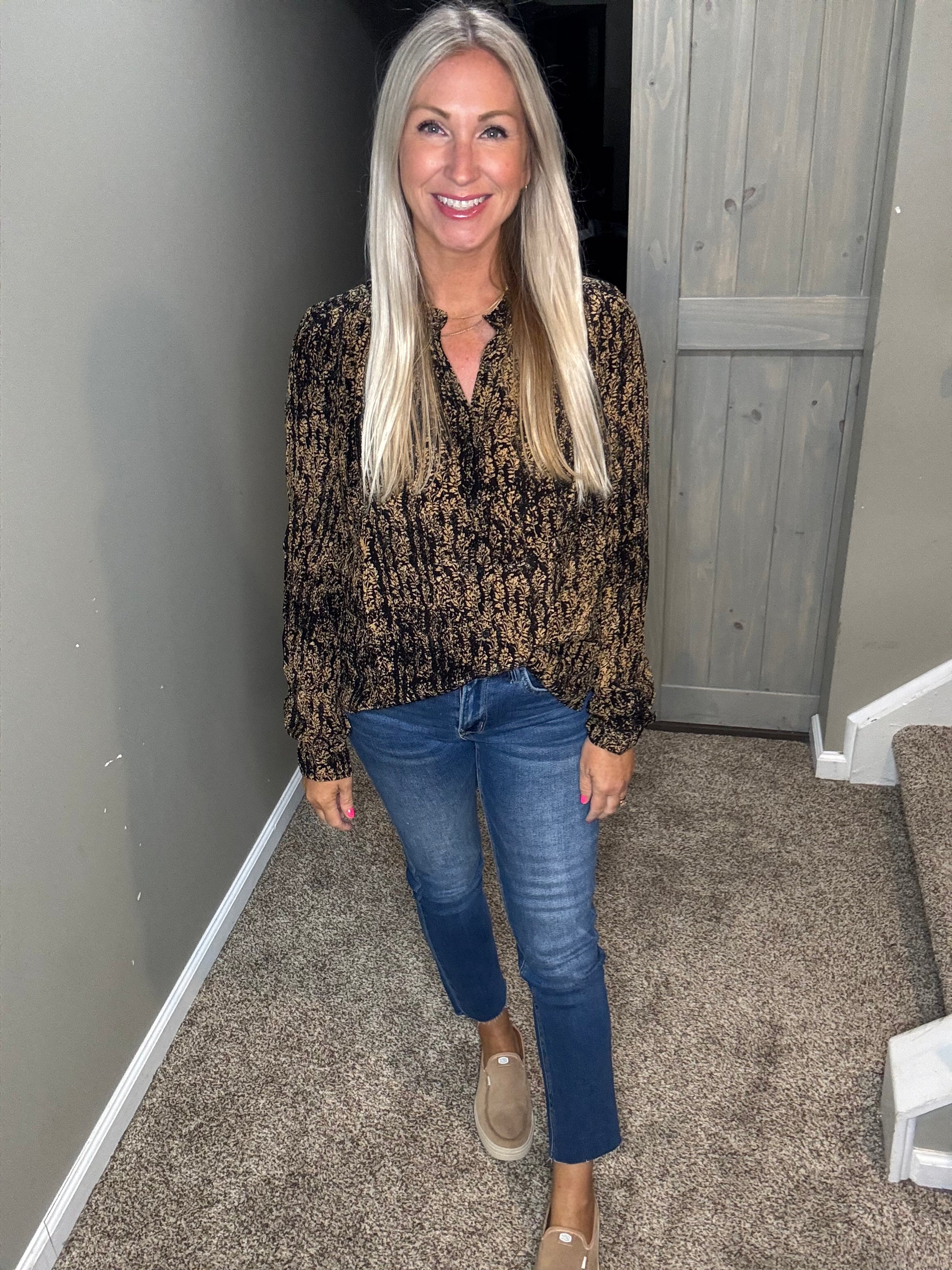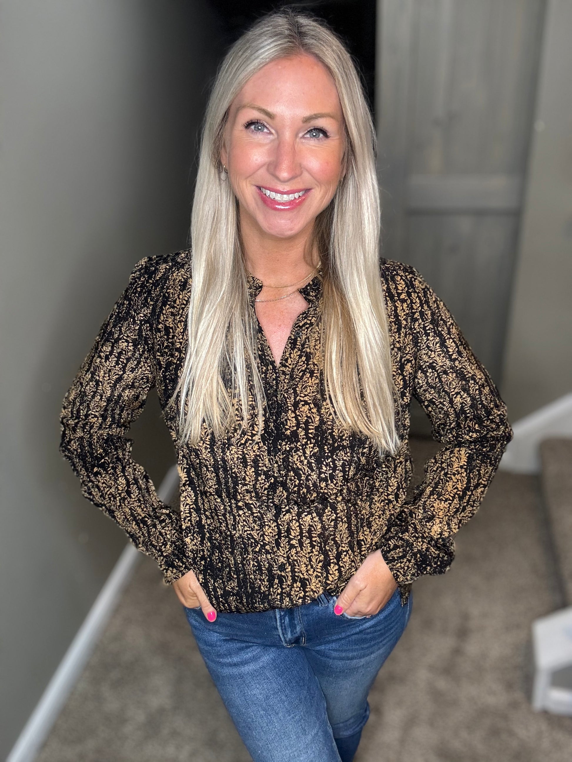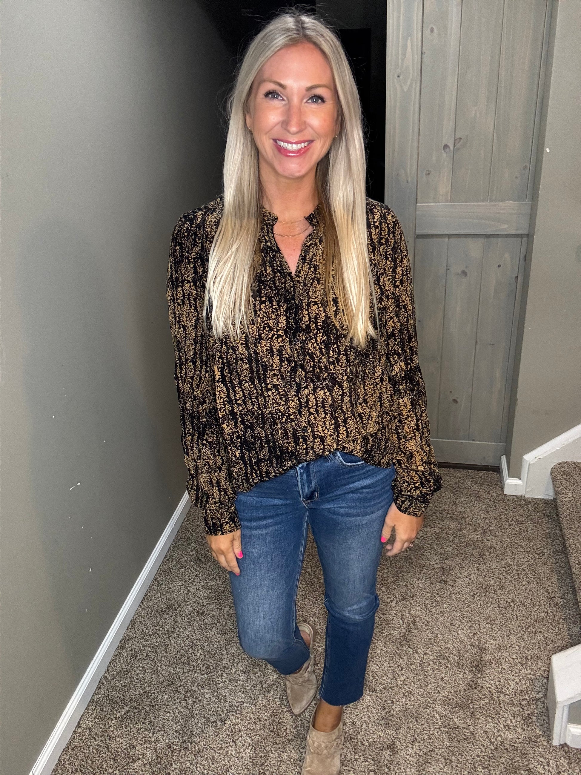 We are LOVING this button up top from Elan! The gorgeous gold floral print is so flattering! The perfect top to wear to work, or out to dinner! We love it front tucked with our favorite denim. Plus, pair it with our Autumn Knit Coat for the ultimate date night look!