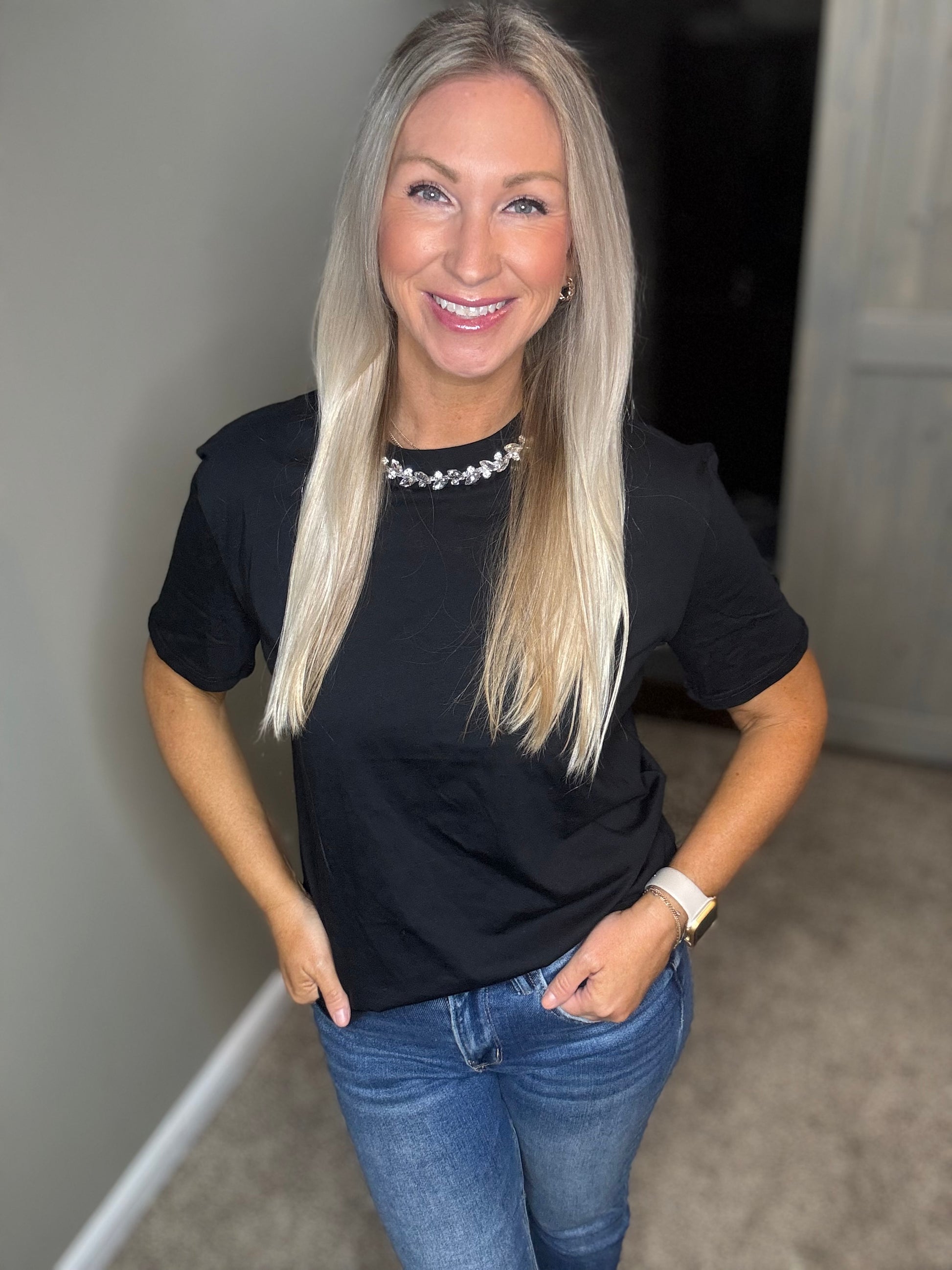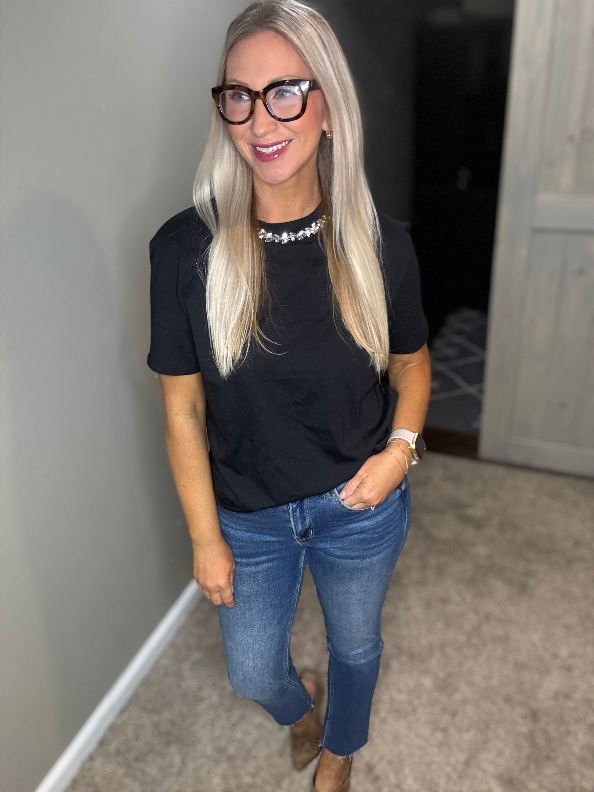 Obsessed. We love this top for so many reasons. You can dress it up or down and personally we're loving it with the suede blazer, denim and sneakers. The jeweled neckline reminds us of J. Crew but with the Elan touch.