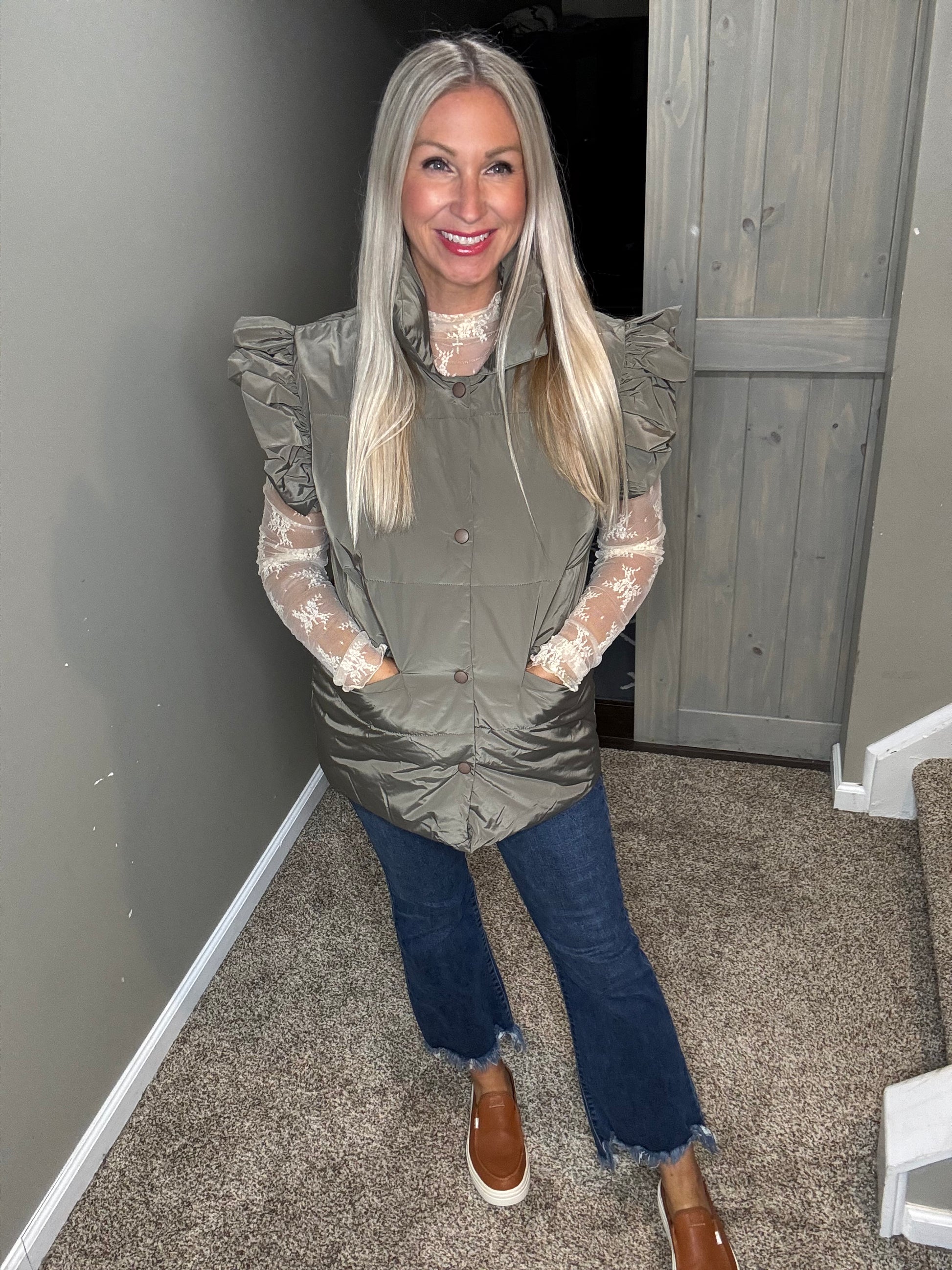 We LOVE these ruffle sleeve vests. The ruffles make it feel so feminine so we are loving it paired with the olive green! Such a chic combo. The vests are perfect for pairing over your favorite top or sweatshirt. The pockets are large and vest has button closure down the front. Dress up or dress down, the best fall layer!