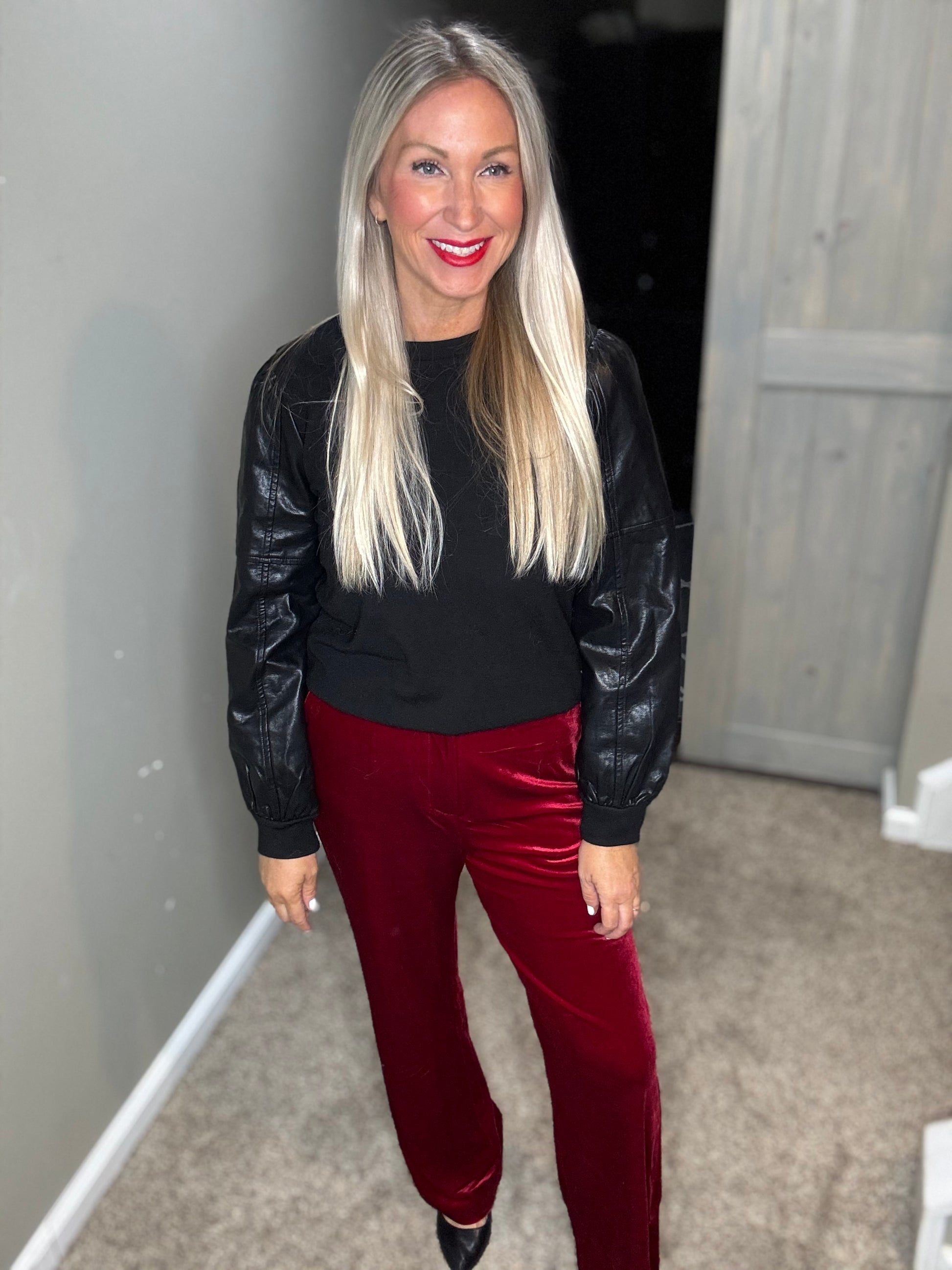 We are LOVING these super soft red velvet pants for the holidays! You can pair them with almost anything. Your favorite Christmas sweatshirt or sweater. Or with your favorite blazer. They have a clasp and zipper closure, plus stretch in the waistband.